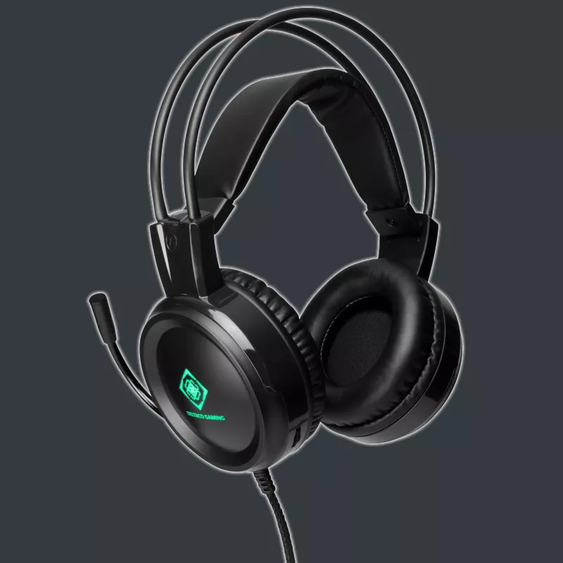 DELTACO GAMING DH110 Gaming-Headset, das für Spiele mit klaren Höhen und sattem Sound geeignet ist, um die Details des Spiels zu unterscheiden. Durch das Ändern der LED-Farbe um die Abdeckungen erhalten Sie einen einzigartigen Look. Die weichen Kissen machen es bequem, während langer Spielesitzungen zu verwenden. Das Headset ist mit einem verstellbaren Kopfbügel und einem flexiblen Mikrofon ausgestattet.
