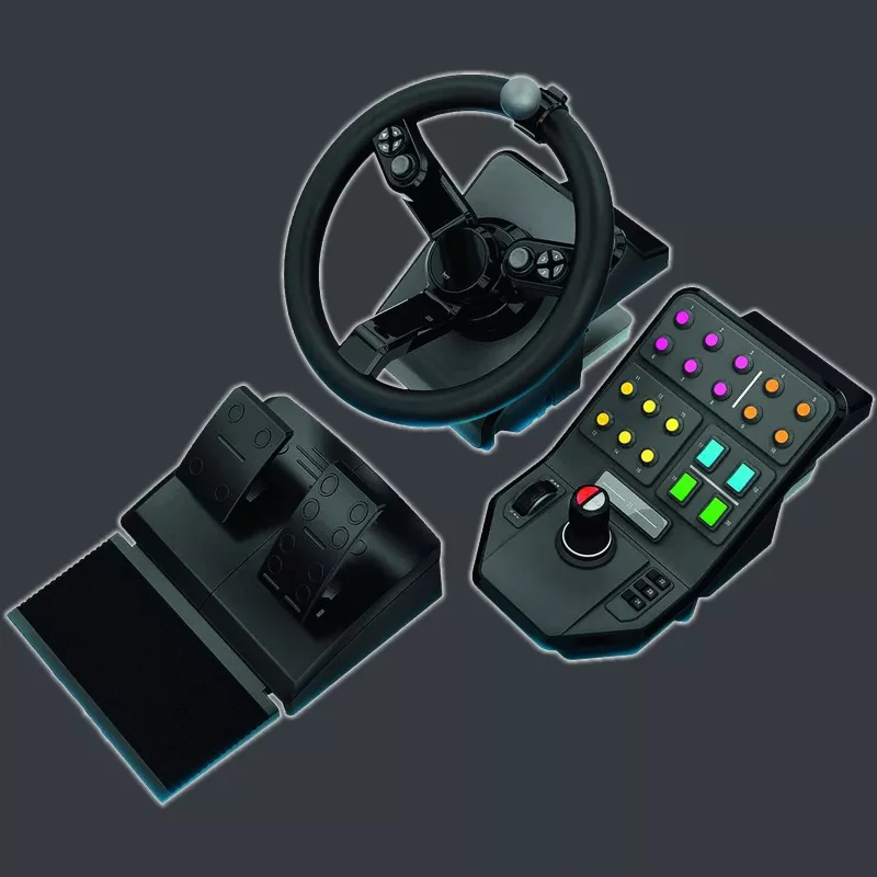 Dieses Eingabegeräte-Set entstand in Zusammenarbeit zwischen Logitech und GIANTS Software. Es ist eine massgeschneiderte Eingabelösung für Simulationen, die die Lenkung schwerer Maschinen beinhalten. Dazu gehören Bekannte Titel wie Farming Simulator, Euro Truck Simulator und Train Simulator. Es eignet sich aber auch komplexe Games anderer Genres wie Elite Dangerous. Das Bundle setzt sich aus Lenkrad, Pedale und einer Seitenkonsole zusammen und stellt Ihnen zahlreiche, frei programmierbare Bedienelemente und Tasten zur Verfügung, die Sie perfekt auf die Software abstimmen können.