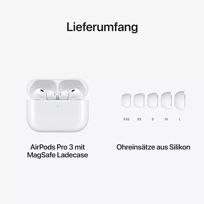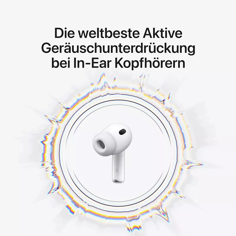 AirPods Pro 3. Bis zu 2x bessere Aktive Geräuschunterdrückung (ANC) als bei den AirPods Pro 2. Jetzt mit Herzfrequenzmessung, Live Übersetzung, längerer Batterielaufzeit und Neuheiten für die Hörgesundheit. Neu designt für noch bessere Passform.