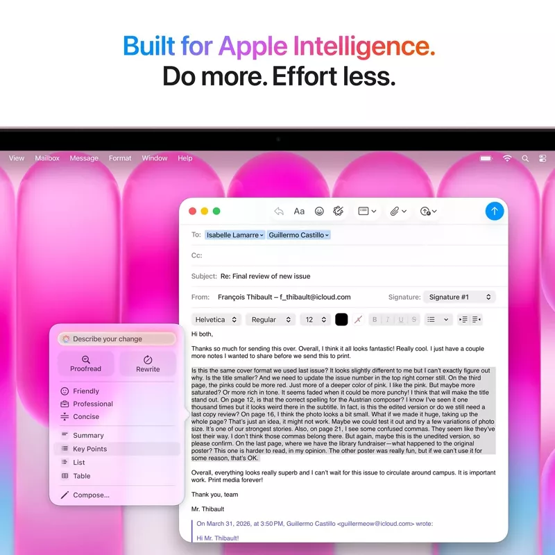 Apple Intelligence ist Ihr persönliches KI System. Es hilft Ihnen, etwas zu schreiben, sich auszudrücken und Aufgaben zu erledigen. Und es ist im MacBook Neo direkt integriert.