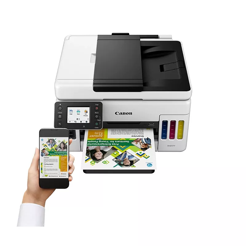 Der Canon MAXIFY GX6050 ist eine ausgezeichnete Wahl für kleine Büros und Home-Offices, die auf die hohe Druckqualität eines Tintenstrahldruckers bestehen, aber gleichzeitig die Kosten für Verbrauchsmaterial gering halten möchten. Das Nachfüllsystem der Canon G-Serie macht es möglich: Anstelle herkömmlicher Tintenpatronen verwendet er grossvolumige Tintenbehälter: Eine Tintenfüllung reicht für bis zu 6000 Seiten in Schwarzweiss oder 14´000 Seiten in Farbe – Werte, die man sonst nur von Laserdruckern kennt. Im Lieferumfang ist bereits ein kompletter Tintensatz enthalten. Ausserdem punktet er mit einer guten Standard-Papierkapazität von 350 Blatt (verteilt auf ein Standardfach und einen Mehrzweck-Einzug) und einer automatischen Duplexeinheit für papiersparendes, beidseitiges Drucken. Zusätzlich zum Drucken kann das Gerät auch scannen und kopieren. Dank 50-Blatt-ADF-Scanner ist das Scannen mehrseitiger Dokumente im Handumdrehen erledigt. Auch bei den Schnittstellen zeigt er sich sehr flexibel. So unterstützt er neben USB-Direktanbindung auch drahtlose und verkabelte Netzwerk-Integration sowie diverse Mobildruck-Standards.
