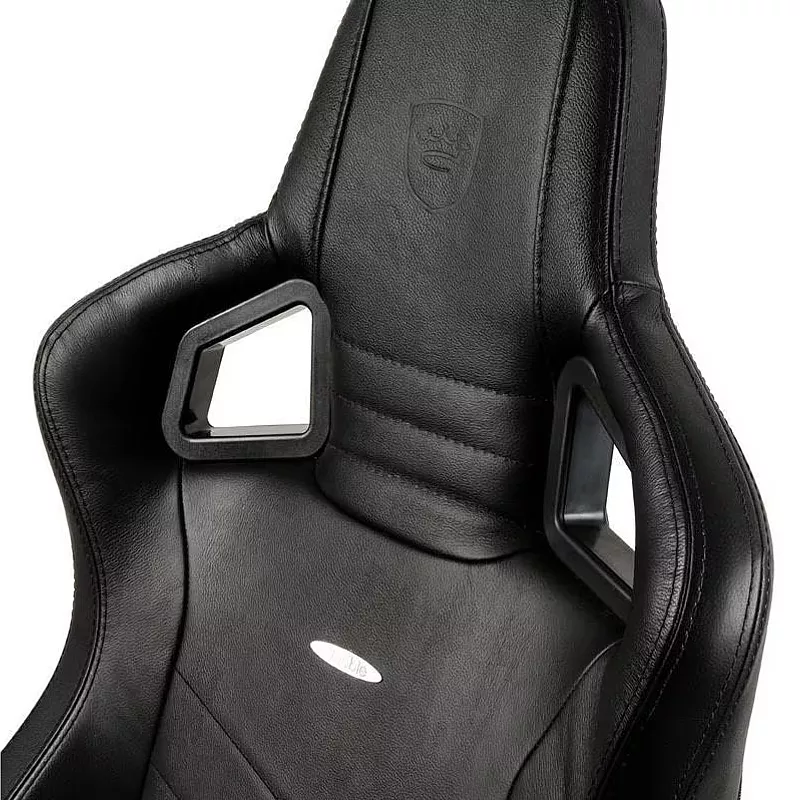 Die schwarze Naht an den Säumen und der Rückenlehne wurde extrem präzise durch industrielle Stickmaschinen eingewebt. Zu einem hohen Wiedererkennungswert des EPIC Black Edition Gaming-Stuhls trägt eine dezente, ovale Aluminiumplakette mit dem noblechair-Schriftzug auf Schulterhöhe und ein eingestanztes Logo auf Kopfhöhe runden das Design des Zocker-Throns ab.