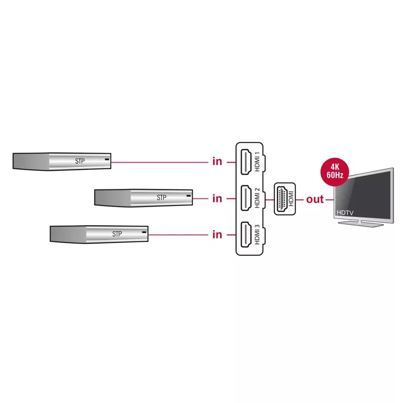 ![]() | Eingang: 3x HDMI-A 19 Pin Buchse, Ausgang: 1x HDMI-A 19 Pin Stecker |