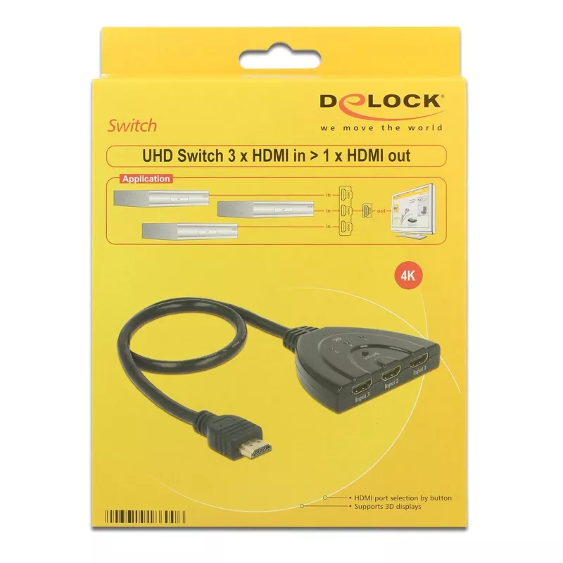 Delock HDMI UHD Switch 3 x HDMI in > 1 x HDMI out 4K mit integriertem Kabel 50 cm