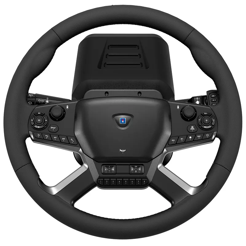 ![]() | Originalgrosses mit Kunstleder überzogenes LKW-Lenkrad mit 40 cm Durchmesser und 1.800 Grad Rotation, positioniert im extra flachen Winkel |