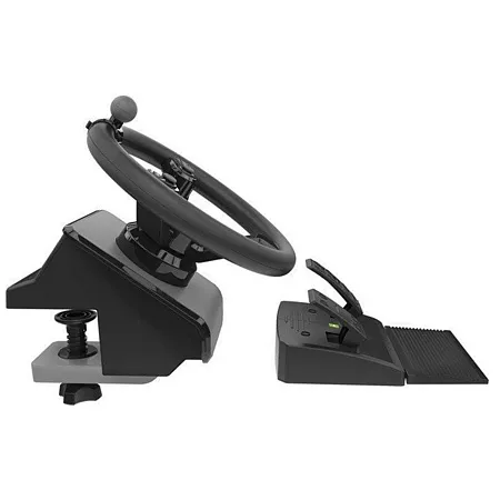 Der extra-grosse 20°-Drehwinkel der dedizierten Gas- und Bremspedale vermittelt ein realistisches Handling schwerer Maschinen und und erlaubt ein sehr fein dosiertes, kontrolliertes Bremsen und Beschleunigen. Die Pedale sind über ein 1,8 m langes Kabel mit dem Lenkrad verbunden, so dass die gesamte Ausrüstung nur einen USB-Anschluss belegt.