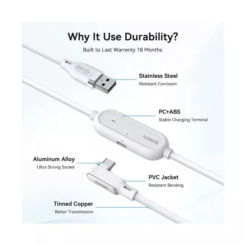 Das 5 Meter lange Kabel ist mit dem USB-3.2-Gen1-Standard sowie einem praktischen USB-C-Stecker im 90°-Design ausgestattet, der für maximale Bewegungsfreiheit und eine stabile Verbindung sorgt. Dank der Play-&-Charge-Funktion können Sie gleichzeitig spielen, laden und Daten mit bis zu 5 Gbit/s übertragen – für ein flüssiges und verzögerungsfreies VR-Erlebnis.