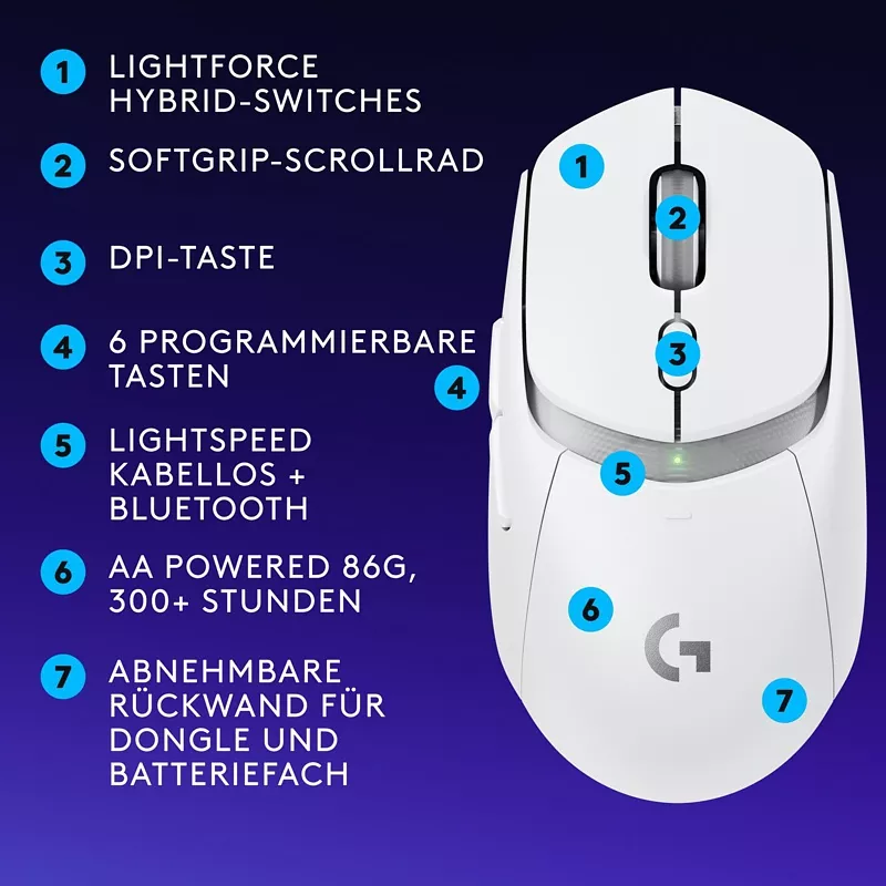 ![]() | Schnelle Drahtlosverbindung über USB-A «LIGHTSPEED»-Funkempfänger und Bluetooth |