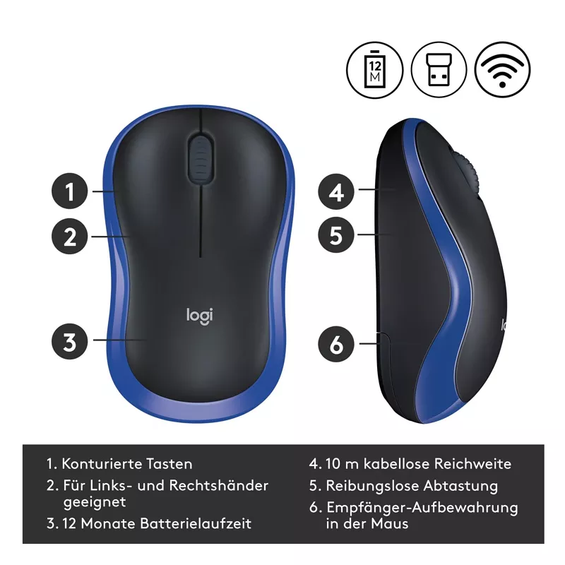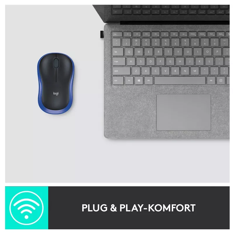 Die einfach zu bedienende Logitech Wireless Mouse M185 ist dank kabellosem Plug&Play direkt nach dem Anschliessen einsatzbereit. Sie profitieren von der Bewegungsfreiheit einer kabellosen Verbindung, die genauso zuverlässig ist wie bei einer kabelgebundenen Maus und einer schnellen Datenübertragung nahezu ohne Verzögerungen oder Ausfälle. Ausserdem bleibt Ihnen ein ganzes Jahr lang ein lästiger Batteriewechsel erspart.