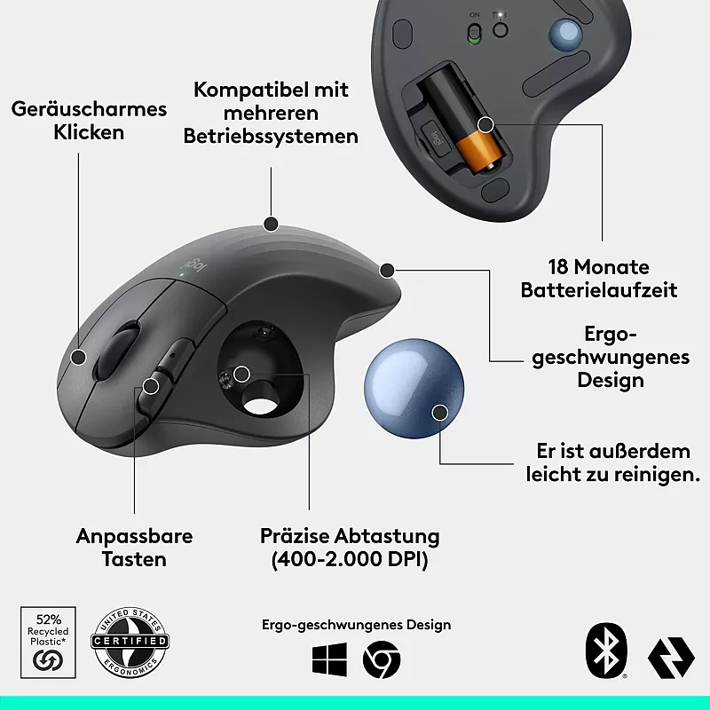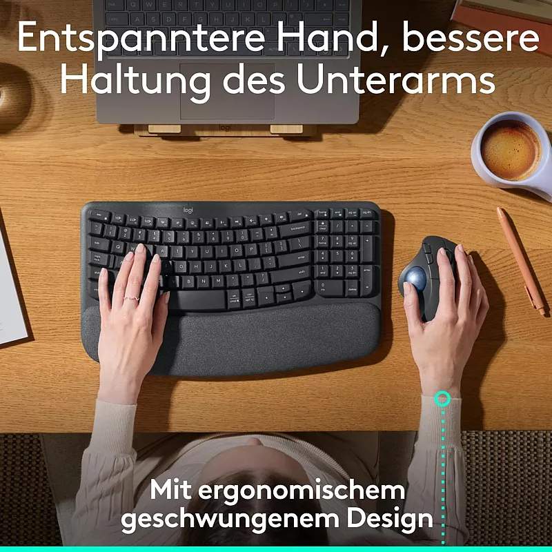 Arbeiten Sie in Ihrer Komfortzone mit dem kabellosen Trackball Ergo M575S, der von Ergonomen für 25% weniger Muskelbelastung in Ihrem Unterarm zertifiziert wurde. Bewegen Sie Ihren Cursor mit sanfter und präziser Daumensteuerung, während ein geformtes ergonomisches Design Ihre Hand entspannt und Ihren Unterarm in einer natürlicheren Haltung hält. Jetzt mit leisen Klicks.