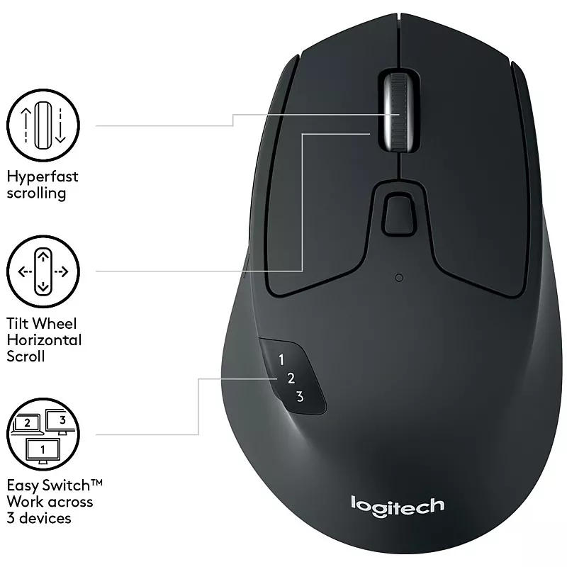 Ausdauernd, flexibel und sehr komfortabel: Die M720 Triathlon lässt sich dank «Easy Switch»-Technologie mit bis zu drei Rechnern koppeln und wechselt nathlos per Knopfdruck zwischen dem Gerät, das Sie gerade steuern möchten. Beim Stromverbrauch gibt sie sich extrem genügsam: Eine einzige AA-Batterie reicht für eine Laufzeit von bis zu zwei Jahren. Das mittelgrosse, für Rechtshänder optimierte Design mit gummierten Griffflächen liegt sehr angenehm in der Hand.