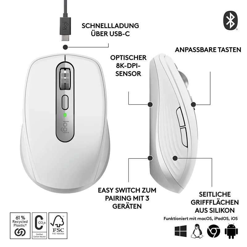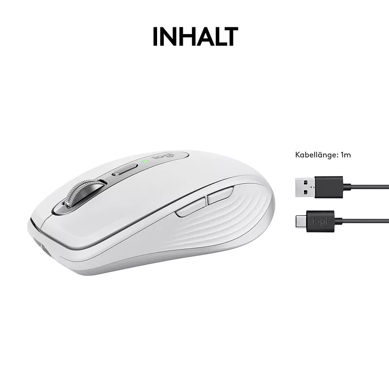Die MX Anywhere 3s von Logitech ist eine handliche Wireless-Maus für Rechtshänder, die mit komfortablem Design, höchster Präzision und flexiblen Drahtlos-Verbindungsmöglichkeiten überzeugt. Sie lässt sich mit bis zu drei Geräten gleichzeitig verbinden und per Tastendruck zwischen ihnen umschalten. Das Scrollrad mit MagSpeed ist zugleich präzise, schnell und beinahe lautlos. Dank ihrer kompakten Form und der langen Akkulaufzeit ist sie eine ausgezeichnete Wahl als Notebook-Maus für unterwegs.