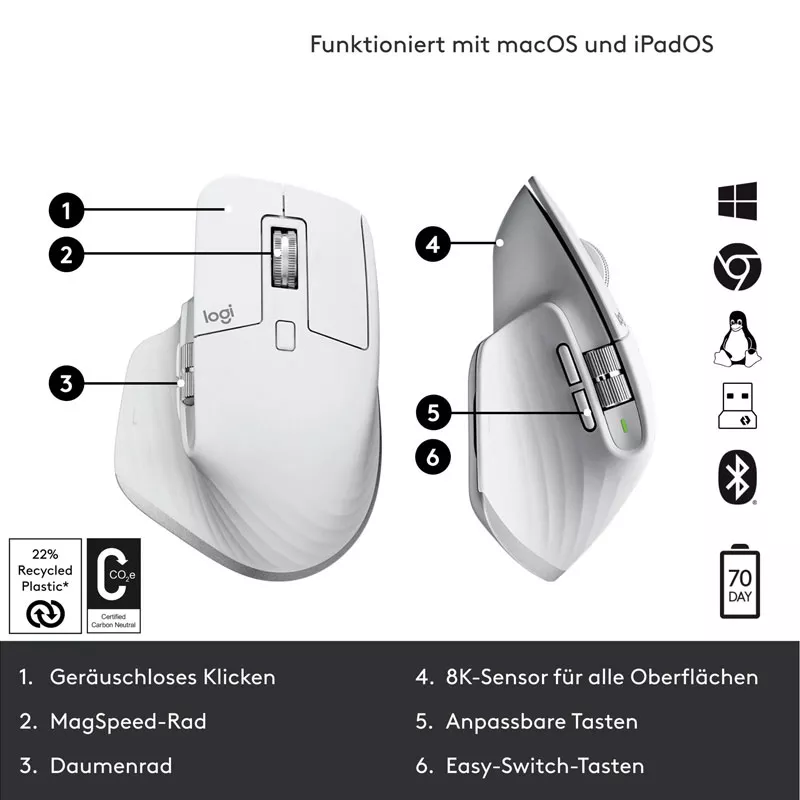 ![]() | Ultraschnelles und besonders leises Scrollen mit MagSpeed-Rad, programmierbares Daumen-Scrollrad, Leise klickende Tasten |