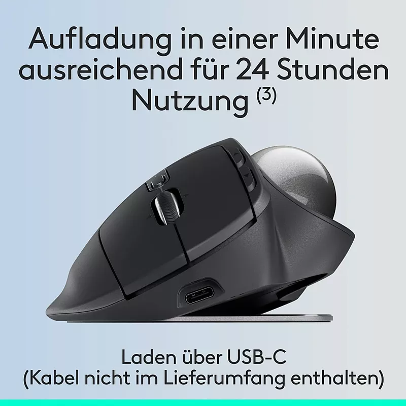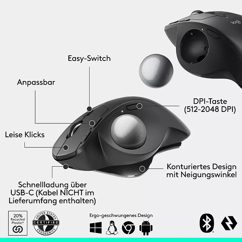 Erleben Sie den von Ergonomen zertifizierten modernen kabellosen Trackball mit einem Neigungswinkel von 20 Grad für 27 % weniger Muskelbelastung im Unterarm. Ausgestattet mit geschmeidigen und präzisen Daumensteuerungen, leisen Klicks, 6 anpassbaren Tasten mit der Logi Options+ App und Schnellladung über USB- C für 24 Stunden Nutzung mit einer Minute Aufladung (Kabel nicht im Lieferumfang enthalten).