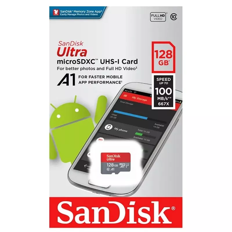 Mit der SanDisk Ultra microSD-UHS-I-Karte können Sie mehr aufnehmen, speichern und freigeben als je zuvor. Die SanDisk Ultra microSD-Karte eignet sich ideal zum Aufnehmen und Ansehen von stundenlangen Full-HD-Videos und .Mit Übertragungsgeschwindigkeiten von bis zu 140 MB/s verschieben Sie Inhalte blitzschnell. Diese Speicherkarte ist ideal für Android-basierte Smartphones und Tablets, da ihr A1-Standard ein schnelleres Laden von Apps ermöglicht.