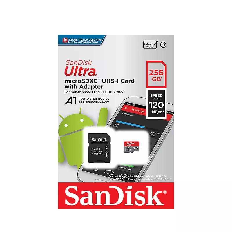 Mit der SanDisk Ultra microSD-UHS-I-Karte können Sie mehr aufnehmen, speichern und freigeben als je zuvor. Die SanDisk Ultra microSD-Karte eignet sich ideal zum Aufnehmen und Ansehen von stundenlangen Full-HD-Videos und .Mit Übertragungsgeschwindigkeiten von bis zu 140 MB/s verschieben Sie Inhalte blitzschnell. Diese Speicherkarte ist ideal für Android-basierte Smartphones und Tablets, da ihr A1-Standard ein schnelleres Laden von Apps ermöglicht.