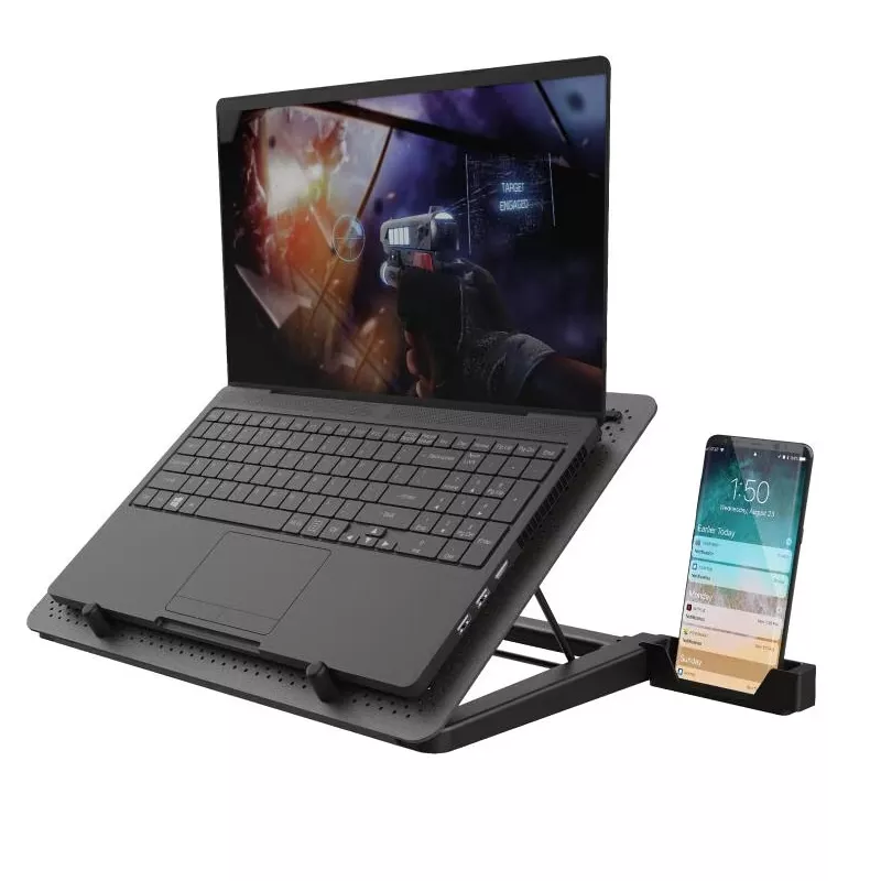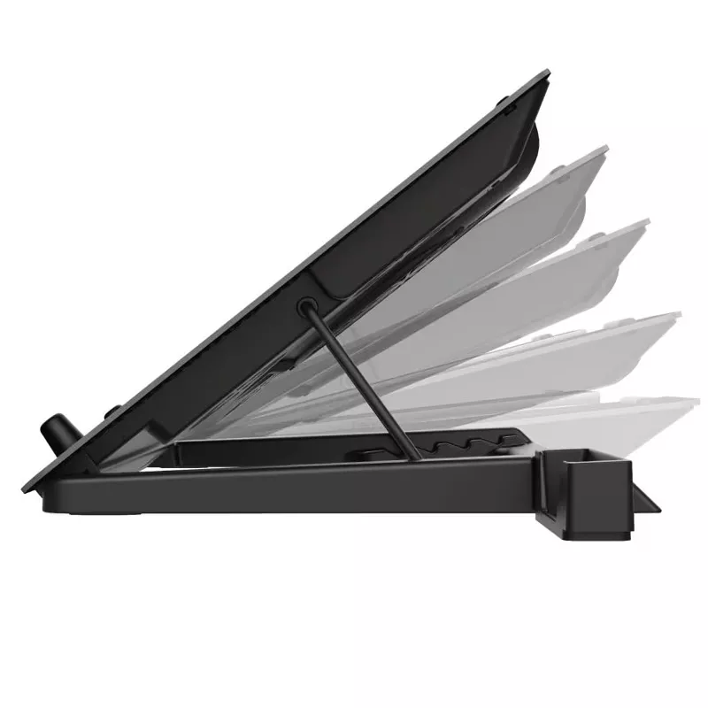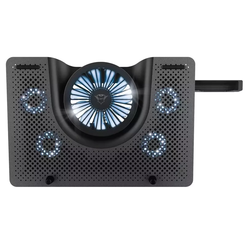 Mit dem GXT 1125 Notebook-Kühler von Trust, bleibt Ihr Notebook auch während der heissesten Gaming-Sessions gut gekühlt. Die robuste Aluminium-Lochplatte bietet auch für grosse Notebooks, mit bis zu 17.3 Zoll Bildschirmdiagonale, ausreichend Platz. Fünf beleuchtete Lüfter, davon einer mit einem Durchmesser von 130mm, sorgen für eine dauerhafte Kühlung und optimieren die Performance Ihres Notebooks. Für den optimalen Sichtwinkel lässt sich die Neigung in 5 Stufen bis zu einer Höhe von 190mm einstellen.