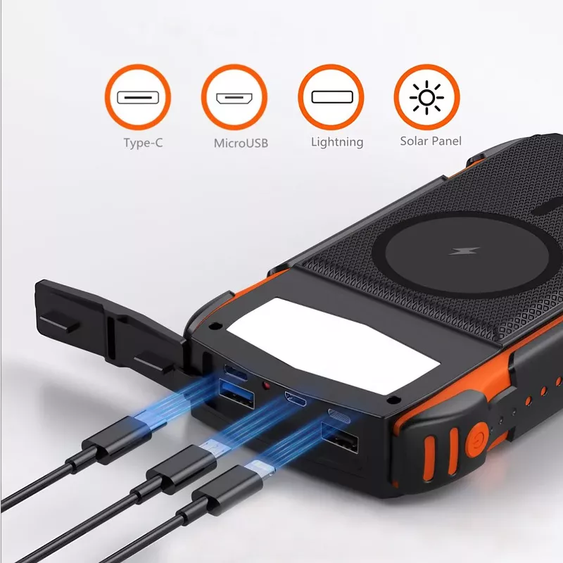 Robuste, wasserdichte Outdoor 20000-mAh-Powerbank mit integriertem Qi-Charger und Solarpanel