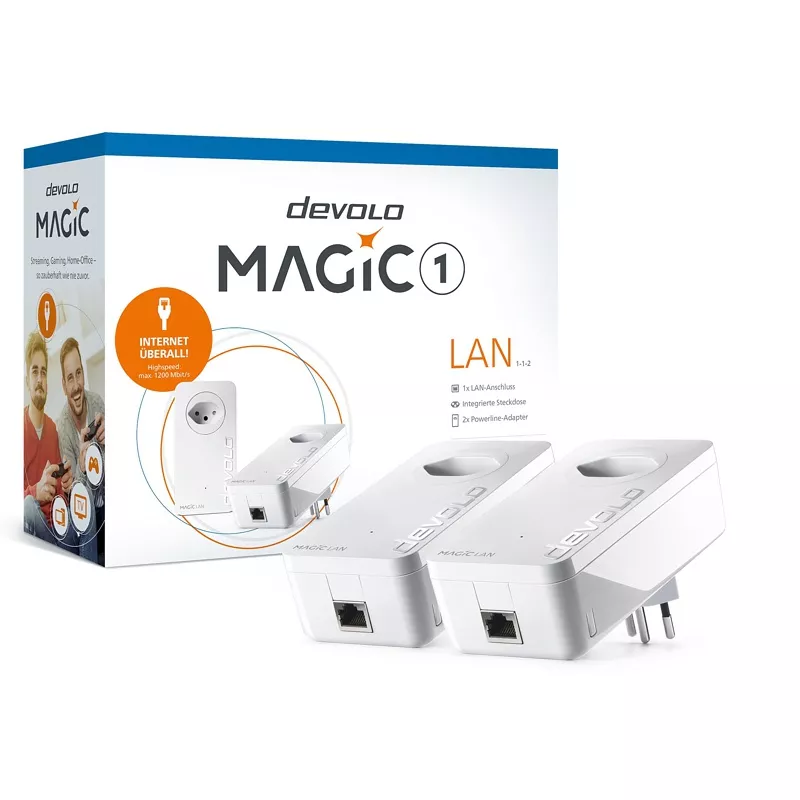 Unkompliziert und unglaublich leistungsfähig – mit dem Powerline-Adapter devolo Magic 1 LAN holen Sie sich zuverlässiges Internet über die Steckdose in Ihr Zuhause. Mit seiner grossen Reichweite von 400 Metern erschliesst der dLAN-Adapter der nächsten Generation dabei auch Räume, die bisher keinen Netzwerkanschluss haben: Ob Online-Gaming auf der Terrasse, Werkeln mit Hilfe von YouTube-Tutorials im Hobbykeller oder effizientes Home-Office im Dachgeschoss, Ihren Ideen und Plänen sind keine Grenzen gesetzt. Einfach devolo Magic 1 LAN in die Steckdose stecken und mit den anderen Magic-Adaptern in Sekundenschnelle – ohne dass Sie etwas konfigurieren müssen – verbinden und loslegen, denn smartes Plug & Play macht es möglich. Sofort einsatzbereit leitet der bewährte Powerline-Adapter Internet mit einer hohen Geschwindigkeit von 1200 Mbps durch Ihr Heimnetzwerk.