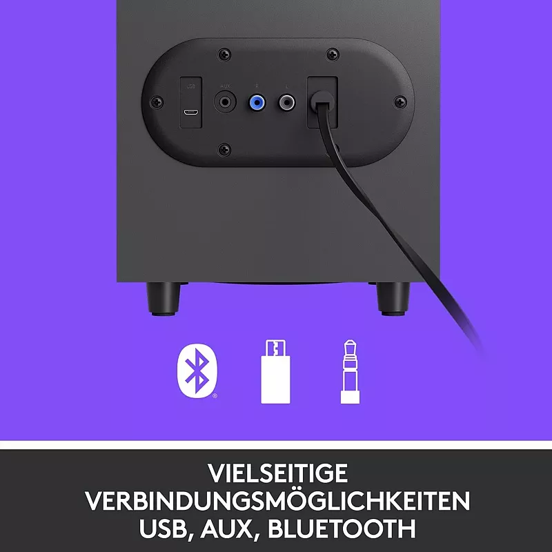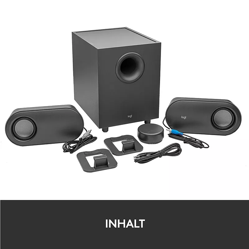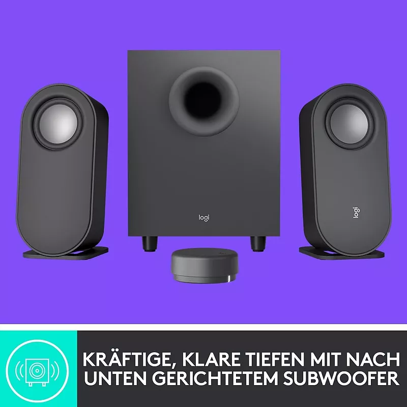 Das Z407 Lautsprechersystem von Logitech liefert beeindruckenden raumfüllenden Sound an Ihrem Schreibtisch. Zwei Lautsprecher mit je 10 Watt RMS und ein Subwoofer mit 20 Watt RMS sorgen für kristallklare und kraftvolle Töne mit satten und tiefen Bässen. Die Verbindung erfolgt wahlweise per Kabel über einen Micro-USB- oder 3.5mm-Klinken-Anschluss oder kabellos mit Bluetooth 5.0. Bis zu drei Geräte lassen sich gleichzeitig verbinden und über den kabellosen Regler nahtlos umschalten. Dieser dient zugleich als Steuerung für die Wiedergabe, Lautstärke und Bässe.