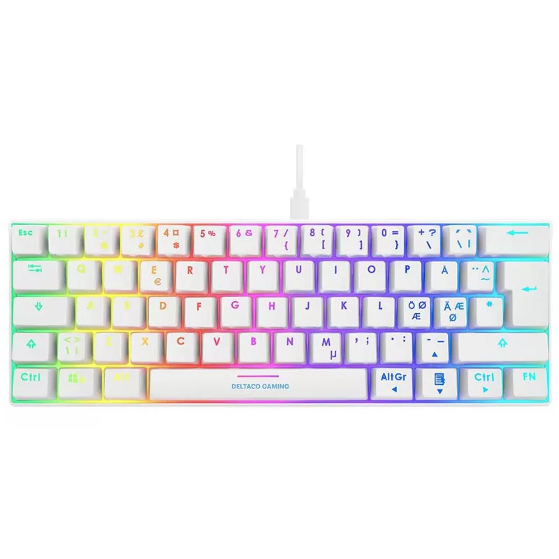Diese Tastatur verfügt über rote RGB-Schalter, ein nordisches ISO-Layout, jedoch ein 60% iges Design, dh nur 62. Tasten. Die Leertaste verwendet keinen Jumper, wird jedoch ganz gerade gedrückt, unabhängig davon, ob Sie in der Mitte oder an der Seite der Taste drücken. Die Tastatur verfügt über insgesamt 19 Lichtmodi (Softwareeinstellungen nicht enthalten). Die meisten Farbpositionen können mit (FN +.) geändert werden. Sie können auch die Geschwindigkeit oder Lichtintensität für die verschiedenen Modi ändern. Wenn ein Geschwindigkeits- oder Intensitätsmodus die niedrigste / höchste Position erreicht, blinkt die Tastatur mit der Feststelltaste und der Windows-Taste.