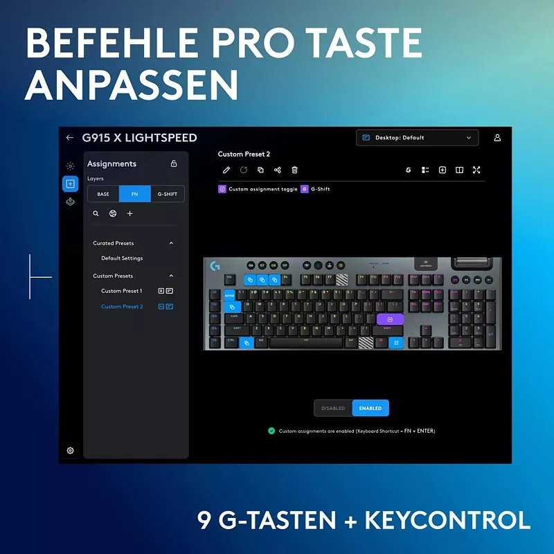Die kabellose flache Gaming- Tastatur G915 X LIGHTSPEED beinhaltet die neuesten Innovationen in der Gaming-Technologie mit einem sorgfältig gestalteten Design und ausgewählten Materialien. Die Dreifach-Konnektivität bietet den klassenbesten kabellosen 2.4- GHz- LIGHTSPEED-, Bluetooth- und kabelgebundenen Datenmodus. Mit KEYCONTROL können Sie bis zu 15 Funktionen pro Taste einrichten. Flache GL-Switches sorgen für mehr APM und damit für noch mehr Geschwindigkeit.
