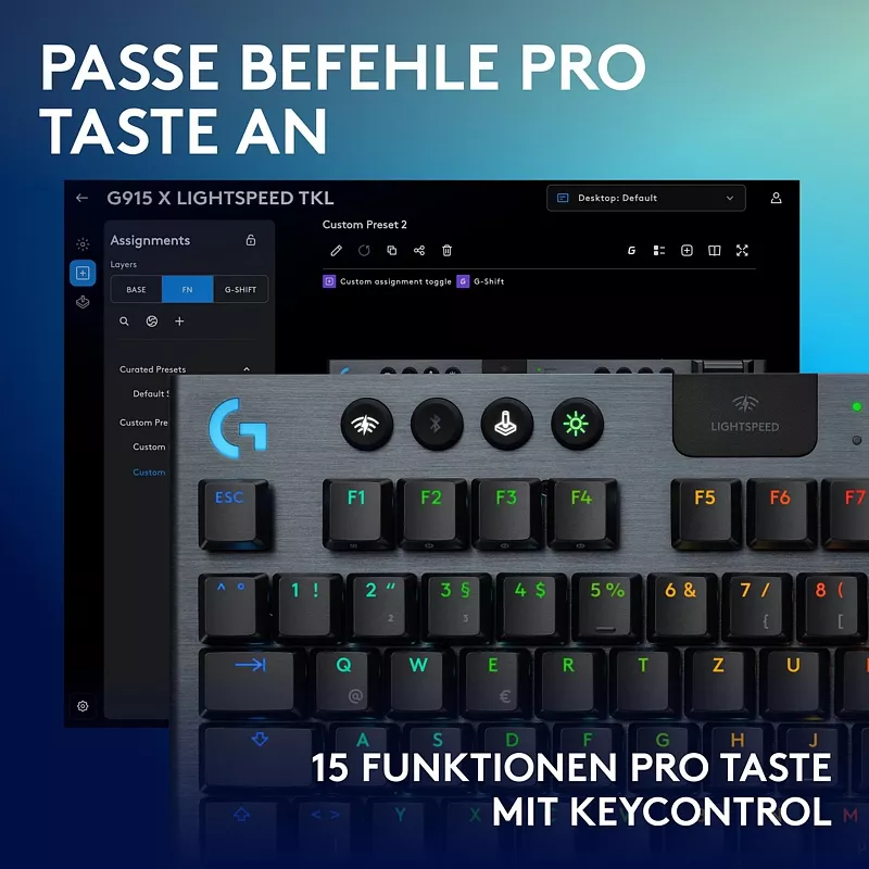 Die kabellose flache Gaming- Tastatur G915 X LIGHTSPEED TKL beinhaltet die neuesten Innovationen in der Gaming-Technologie mit einem sorgfältig gestalteten Design und ausgewählten Materialien. Die Dreifach-Konnektivität bietet den klassenbesten kabellosen 2.4- GHz- LIGHTSPEED-, Bluetooth- und kabelgebundenen Datenmodus. Mit KEYCONTROL können Sie bis zu 15 Funktionen pro Taste einrichten. Sorgfältig gefertigte flache GL- Switches sorgen für mehr APM und damit für noch mehr Geschwindigkeit.