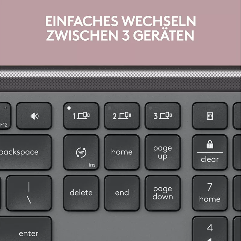 ![]() | Kabellose Verbindung über Bluetooth LE 5.1 oder Logi-Bolt USB-Empfänger (bis zu 10 Meter Reichweite) – Schneller Wechsel durch bis zu 3 verbundenen Geräten mit Easy-Switch-Taste |