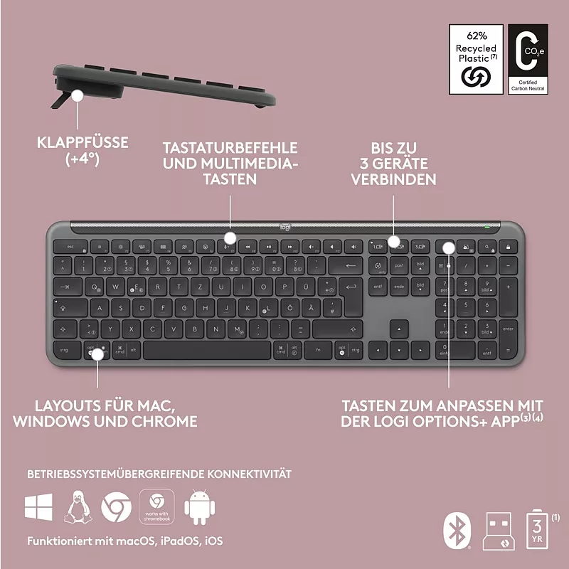 Wechseln Sie mit der Signature Slim K950 Tastatur zwischen Ihrem Computer, Tablet und Smartphone. Bringen Sie etwas Magie in Ihr Arbeitsleben mit Anpassungen und Shortcuts, die Ihnen volle Kontrolle geben. Durch leises Tippen können Sie sich besser konzentrieren und andere werden weniger gestört. Stellen Sie eine kabellose Verbindung über Bluetooth oder den mitgelieferten Logi Bolt USB-Empfänger her.