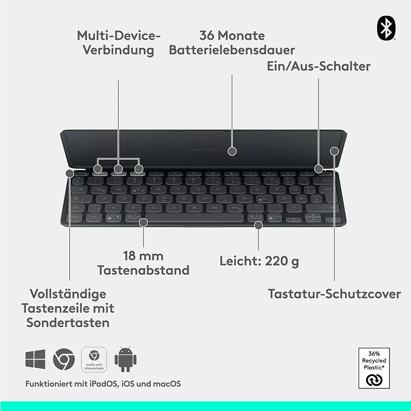 ![]() | Kompakte Bluetooth Tastatur für Geeignet für Tablets und Geräten mit Windows, Android, macOS und ChromeOS |
