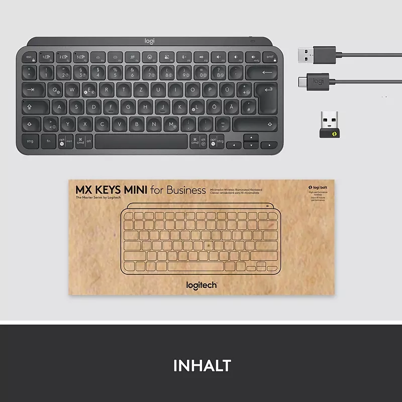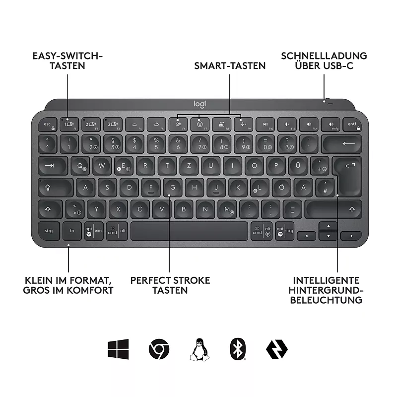 Die MX Keys Mini ist eine kleine, intelligente und leistungsstarke minimalistische kabellose Tastatur speziell für Kreative. Der minimalistische Formfaktor sorgt für verbesserte Ergonomie durch günstigere Ausrichtung der Schultern und die Möglichkeit, die Maus näher an der Tastatur zu platzieren. Dadurch müssen Sie den Arm weniger weit ausstrecken und arbeiten komfortabler mit besserer Körperhaltung. PerfectStroke-Tasten sind speziell für Ihre Fingerspitzen geformt und bieten optimale Tastenstabilität und taktile Reaktion, damit Sie in Ihrem Flow bleiben. Die Hintergrundbeleuchtung wird eingeschaltet, sobald Ihre Hände sich der Tastatur nähern, und passt sich automatisch an wechselnde Lichtverhältnisse an. Smart Dictation, Mikrofon-Stummschaltung und Emoji-Tasten optimieren Ihren Arbeitsablauf weiter. Arbeiten Sie nahtlos auf mehreren Computern, indem Sie MX Keys Mini mit einer Flow-fähigen MX Master 3 oder MX Anywhere 3 kombinieren.