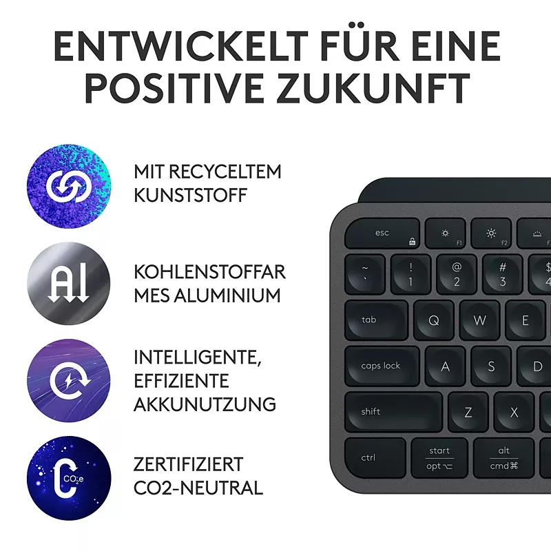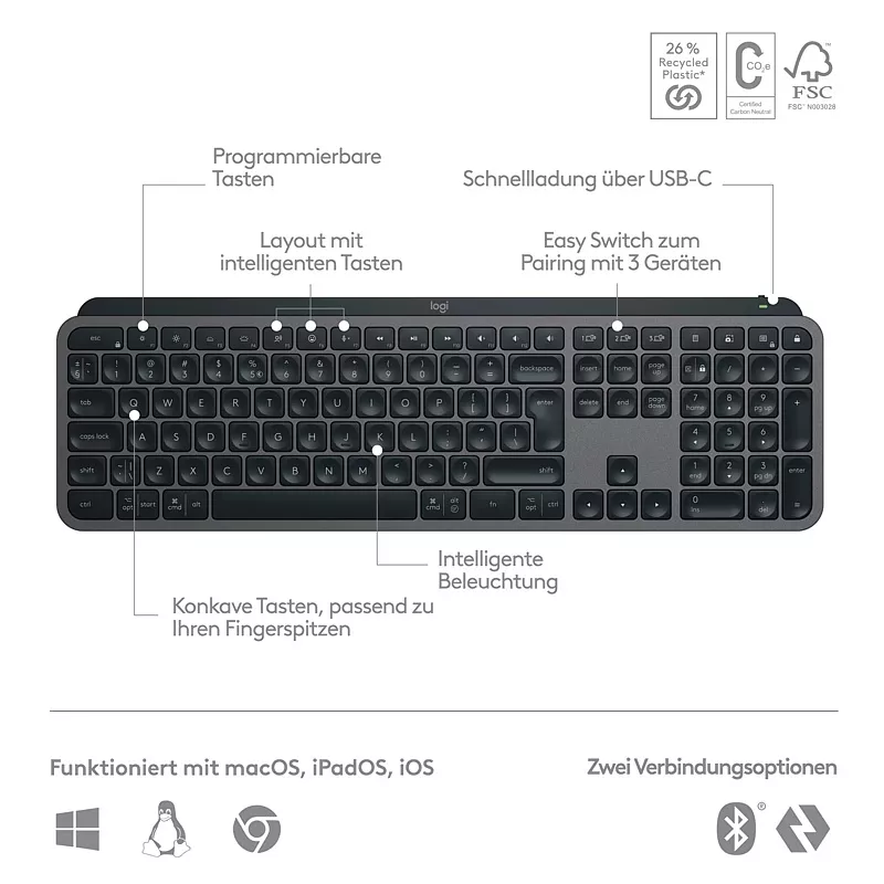 ![]() | Multi-Device: Kopplung mit bis zu 3 Geräten über Bluetooth Low Energy oder über mitgelieferten Logi Bolt USB-Empfänger |