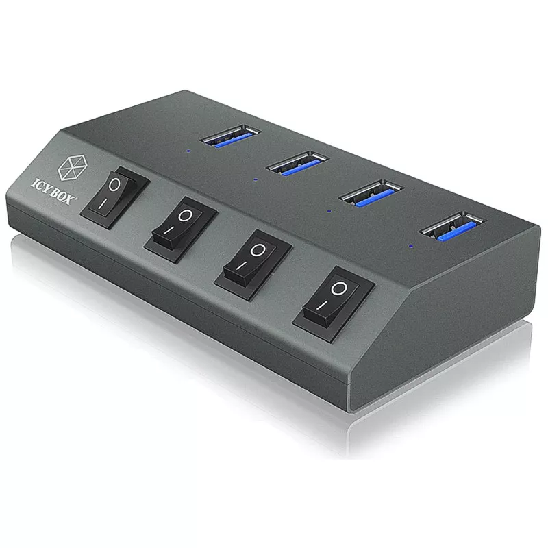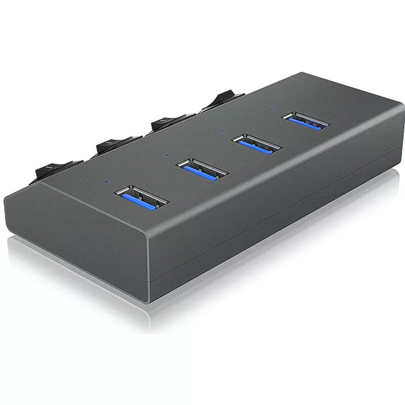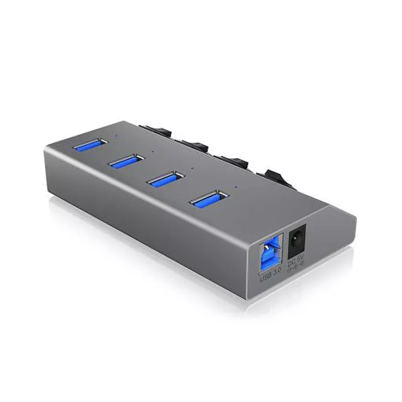 Der IB-HUB1405 kann dank USB 3.0 eine maximale Bandbreite von bis zu 5 Gbit/s erreichen. Alle Ports können im laufenden Betrieb einzeln per Schalter an- und ausgeschaltet werden, ohne die Funktion der anderen Ports zu unterbrechen. Mit dem 5 V Steckernetzteil lässt sich der Hub als aktives Ladegerät betreiben. Die USB Anschlüsse (5 V / 2,4 A) entsprechen der neuen Batterieladespezifikation (BC 1.2) und bietet eine bequeme Möglichkeit zum Aufladen von Smartphones, Tablets, Digitalkameras, Akkus o.Ä.