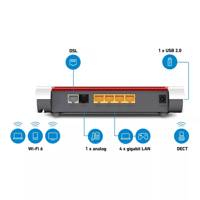 Die FRITZ!Box 7530 AX ist für alle DSL-Anschlüsse bis 300 MBit/s geeignet. Ob ADSL, ADSL2+, VDSL oder Supervectoring 35b: Ihre FRITZ!Box stellt die Verbindung her und Sie geniessen Highspeed im Internet. Vier Gigabit-LAN-Anschlüsse sowie ein USB-Anschluss bieten vielfältige Möglichkeiten: Sie können damit nicht nur all Ihre Endgeräte mühelos ins Netzwerk integrieren, sondern auch Ihren Drucker einbinden und einen USB-Speicher bereitstellen. So nutzen Sie Ihre Filme, Bilder und Musik wann und wo Sie möchten.