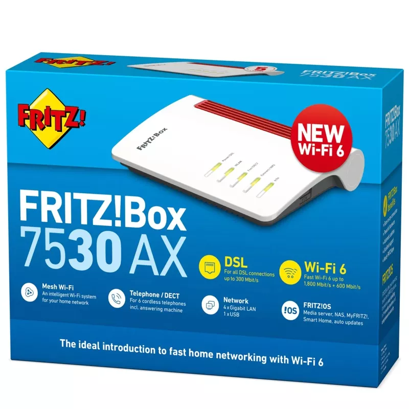 Das neue Wi-Fi 6 (WLAN AX) für alle DSL- und VDSL-Anschlüsse inklusive Supervectoring 35b: Die FRITZ!Box 7530 AX hat die neueste Technologie an Bord und verbindet mühelos alle Ihre Geräte mit dem Internet.