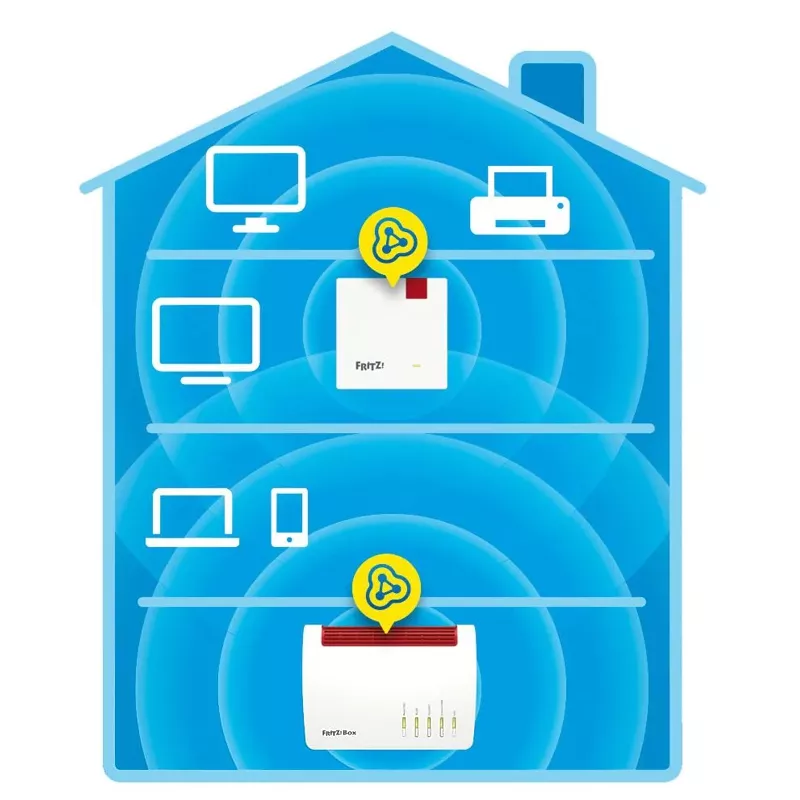 Im WLAN Mesh werden mehrere verteilte WLAN-Zugangspunkte (z.B. FRITZ!Box und FRITZ!Repeater) zu einem einzigen intelligenten WLAN-Netz zusammengefasst. Die verteilten FRITZ!-Geräte tauschen sich untereinander aus und optimieren die Leistung aller WLAN-Geräte. Intelligente Technologien wie Crossband-Repeating, Bandsteering sowie der erweiterte Autokanal sorgen für eine stets optimale WLAN-Versorgung. So wird die beste Verbindung immer dort aufgebaut, wo sie gerade benötigt wird. Streamings, Gaming und Downloads gelangen nahtlos und mit Höchstgeschwindigkeit bis in den letzten Winkel jedes Zimmers. Das gesamte WLAN hat praktischerweise nur noch einen Namen, ein Passwort und ist sicher verschlüsselt.