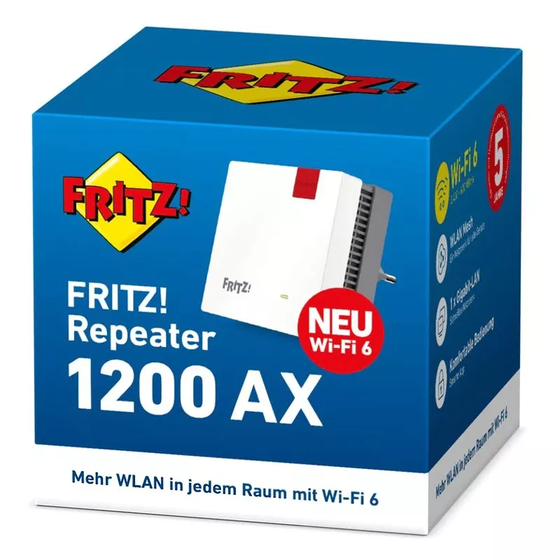 Der FRITZ!Repeater 1200 AX erhöht schnell und einfach die Reichweite jedes WLAN. Innovatives Wi-Fi 6 sorgt für höhere Datenraten und eine bessere Verteilung der verfügbaren Bandbreite an alle verbundenen Endgeräte. Gleichzeitig sorgt der FRITZ!Repeater 1200 AX für eine perfekte Funkabdeckung bis in den letzten Winkel von Haus und Wohnung.