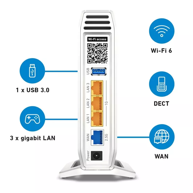 FRITZ!Box 4060 ist ein Triband-WLAN-Router mit 4 x 4 Wi-Fi 6 (WLAN AX)- Ausstattung inkl. Multi-User MIMO (MU-MIMO) und WLAN-Mesh-Funktion. Das neue Flaggschiffmodell der 40er-Serie besitzt erstmalig eine DECTBasisstation mit DECT ULE, wodurch Telefonie- und Smart-HomeFunktionen möglich sind. Des Weiteren sorgt ein 2.5-GBit/s-WAN-Port für eine sehr schnelle Internetanbindung an beispielsweise einem Kabel- oder Glasfasermodem. Der WAN-Port kann bei Bedarf auch als zusätzlicher 2.5- GBit/s-LAN-Port verwendet werden. Mit drei Gigabit-Ethernet-Anschlüssen können Computer oder netzwerkfähige Geräte mit Gigabit-Tempo ins Heimnetz eingebunden werden. Darüber hinaus sind in der FRITZ!Box 4060 eine VoIP-Telefonanlage sowie ein NAS mit einem schnellen USB-3.0- Anschluss integriert.
