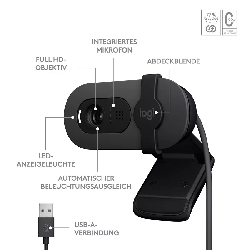 Präsentieren Sie sich noch besser in Bild und Ton mit Brio 100, einer einfachen und kostengünstigen Webcam, und seien Sie Ihr bestes Ich in Videogesprächen. Die Full HD-Auflösung mit 1080p und die automatische Belichtungskorrektur sorgen für Klarheit und hellere Beleuchtung in Ihren Gesprächen und lassen Sie optimal zur Geltung kommen. Ihre Stimme ist deutlicher zu hören durch das eingebaute Mikrofon und die integrierte Abdeckblende sorgt für absolute Privatsphäre.